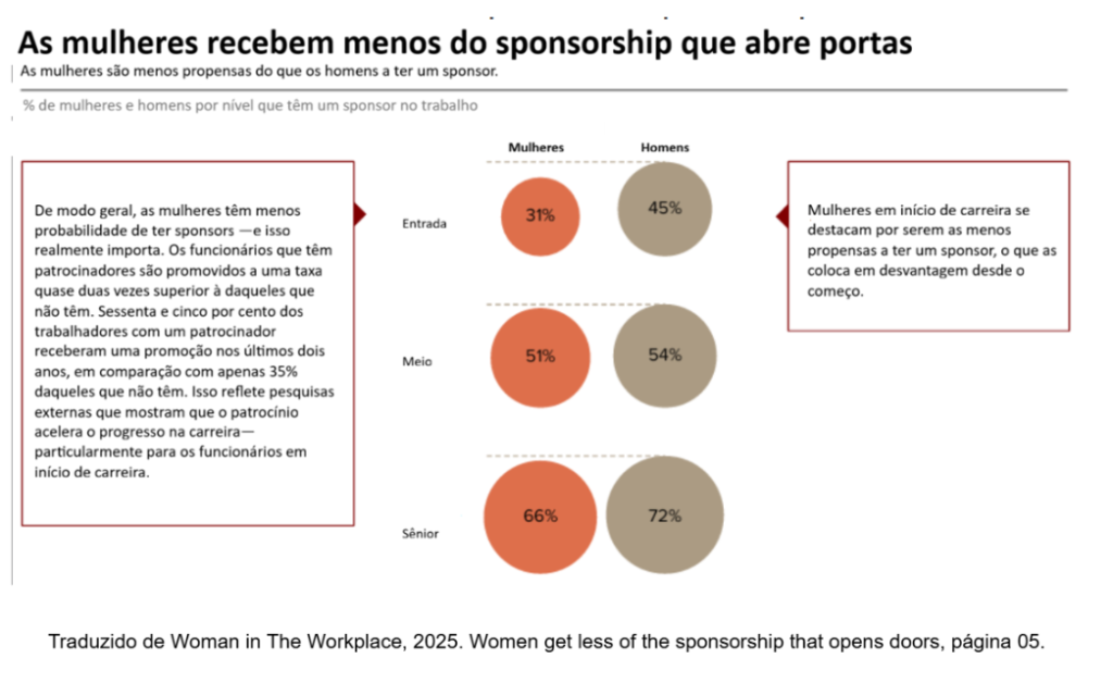 De acordo com o relatório, a desigualdade no acesso a sponsorship surge logo nas fases iniciais da trajectória profissional. O sponsorship é descrito como um mecanismo de defesa activa em espaços de decisão, incluindo indicações para projectos estratégicos, validação pública de prontidão e influência em processos de promoção.